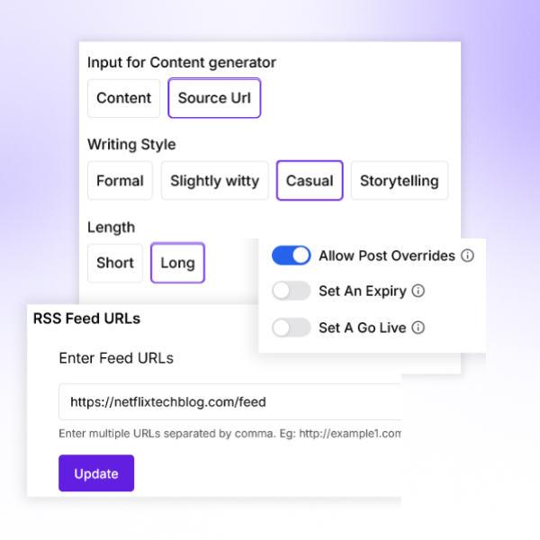 - Content builder with post captions, images, and CTAs