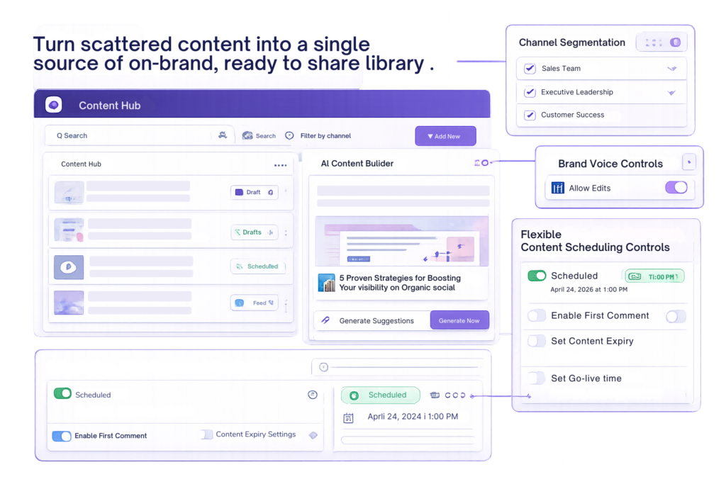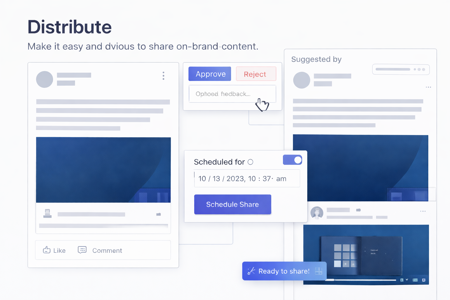 Content lives in Notion docs, Slack threads, and scattered email chains. Employees want to post but don’t know what’s safe or worth sharing. Content gets published but never distributed.